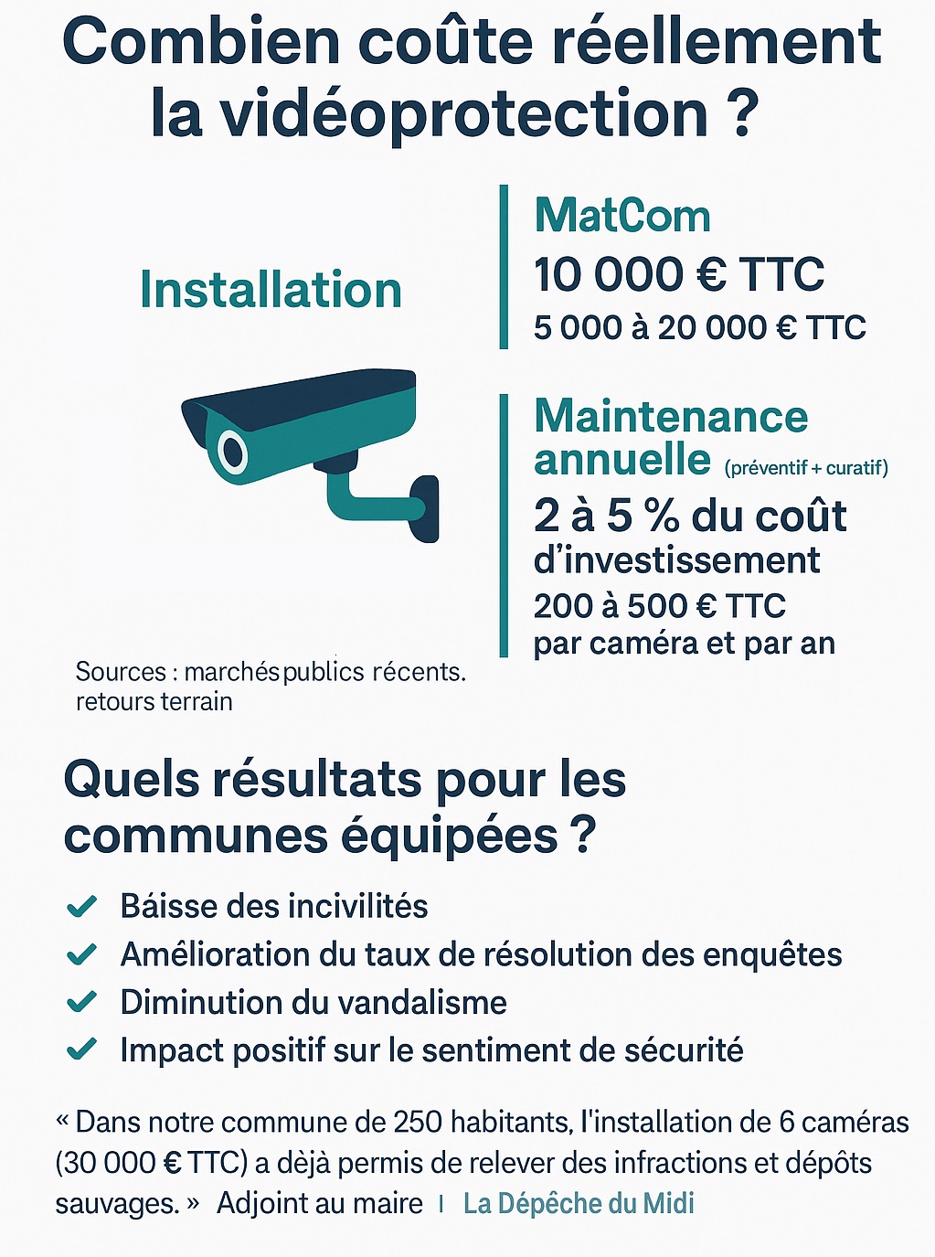 Ces ordres de grandeur reposent sur l’analyse de plusieurs marchés publics récents en vidéoprotection et sur les retours terrain des collectivités.